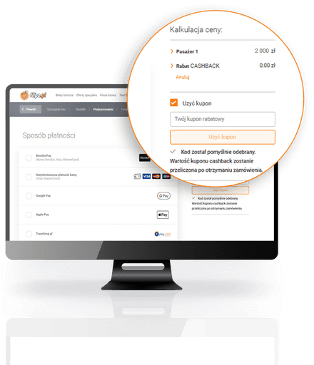Planujesz urlop i dokonujesz rezerwacji lotów na Flipo o wartości 2000 zł. Przed zakończeniem zamówienia podasz kod cashback i zapłacisz za bilety lotnicze.